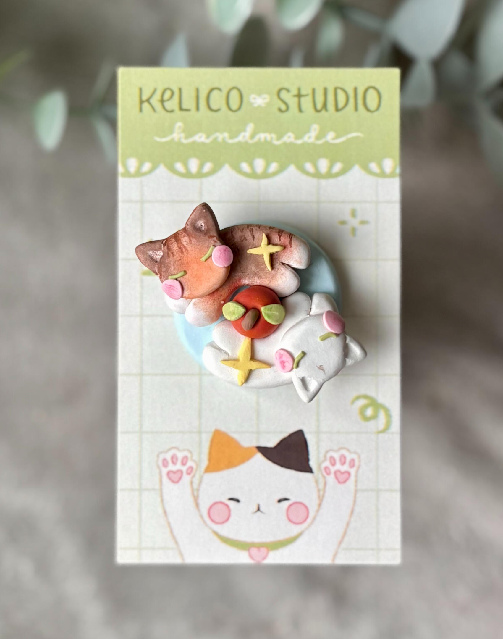 Kelly is a Chinese-American mixed media artist inspired by cats, colors, and lucky charms. She created Kelico Studio (like "calico") to follow her dream of making art a bigger part of her life and livelihood. She creates with her fellow creators, trinket collectors, and cat lovers in mind. Her art includes original designs, fan art, and handmade clay creations. Thank you for being a part of her journey!